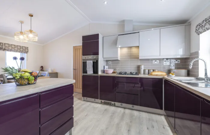 PLEASE NOTE: The aubergine coloured doors and drawers shown in the kitchen / utility room images and 3D space have been discontinued, these have been replaced with Gloss Acrylic Cashmere to match the top units.